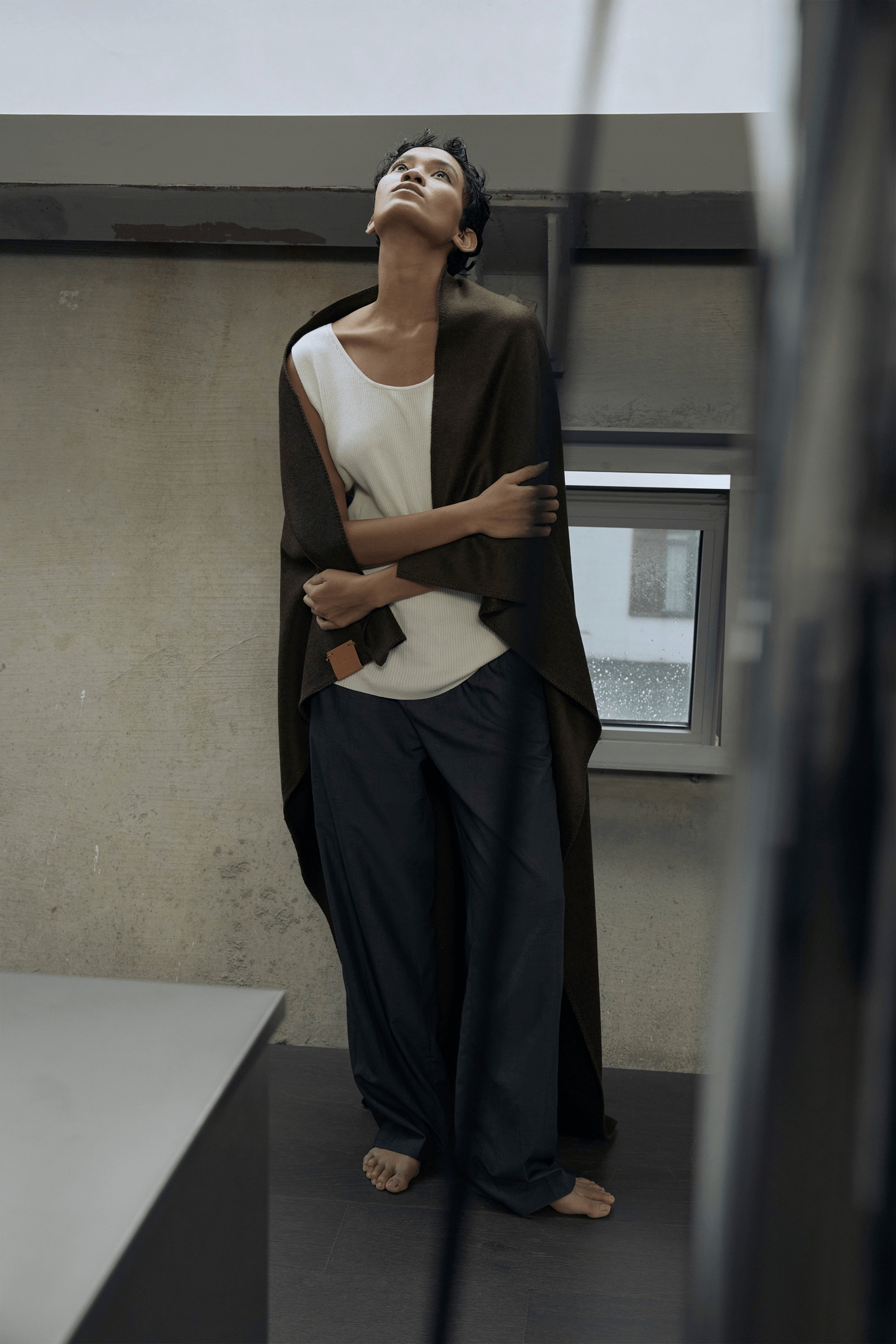 The sculptural cut allows it to sit comfortably across shoulders, layer over sweaters or coats, or be folded compactly for travel. Suitable for all genders and body types.