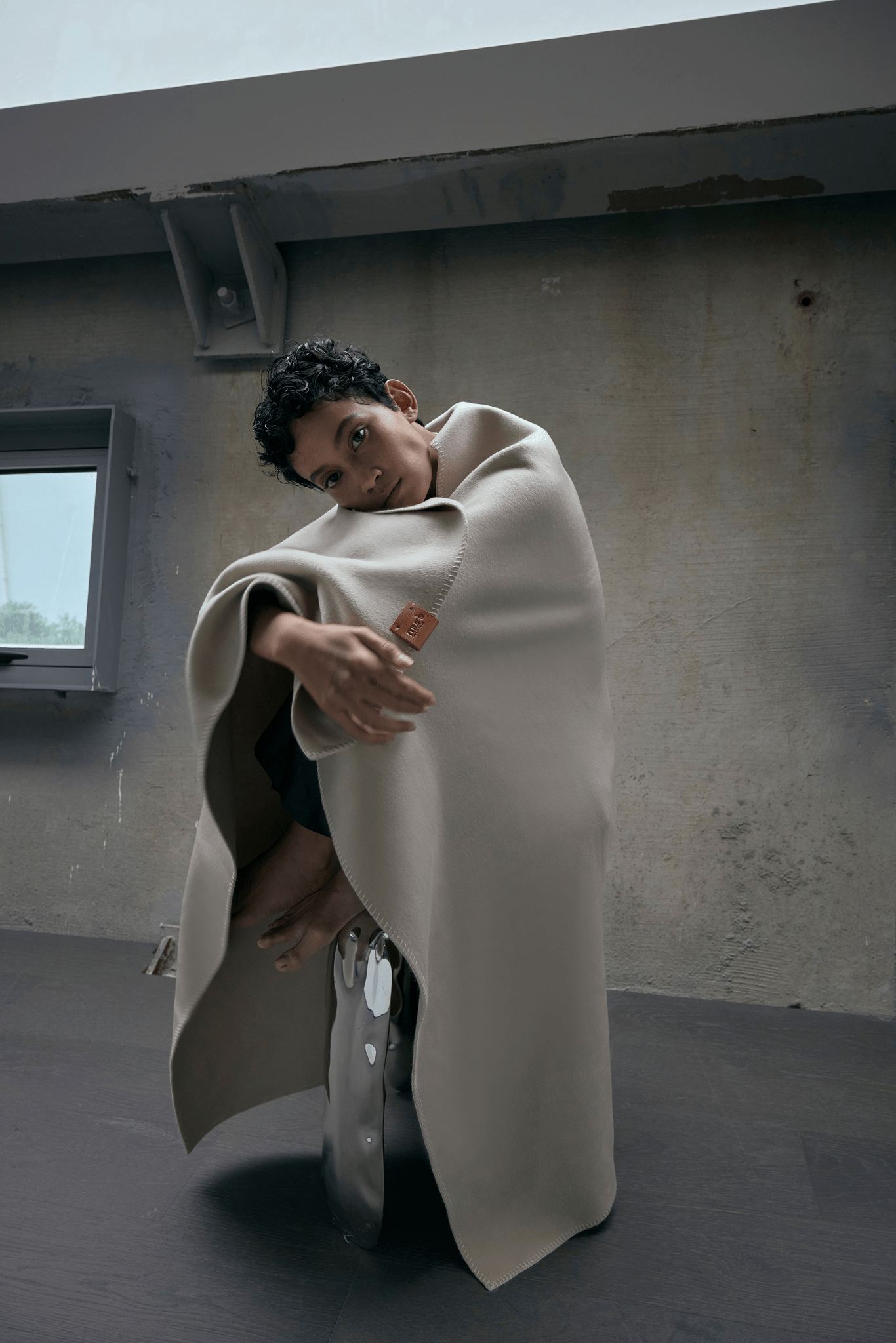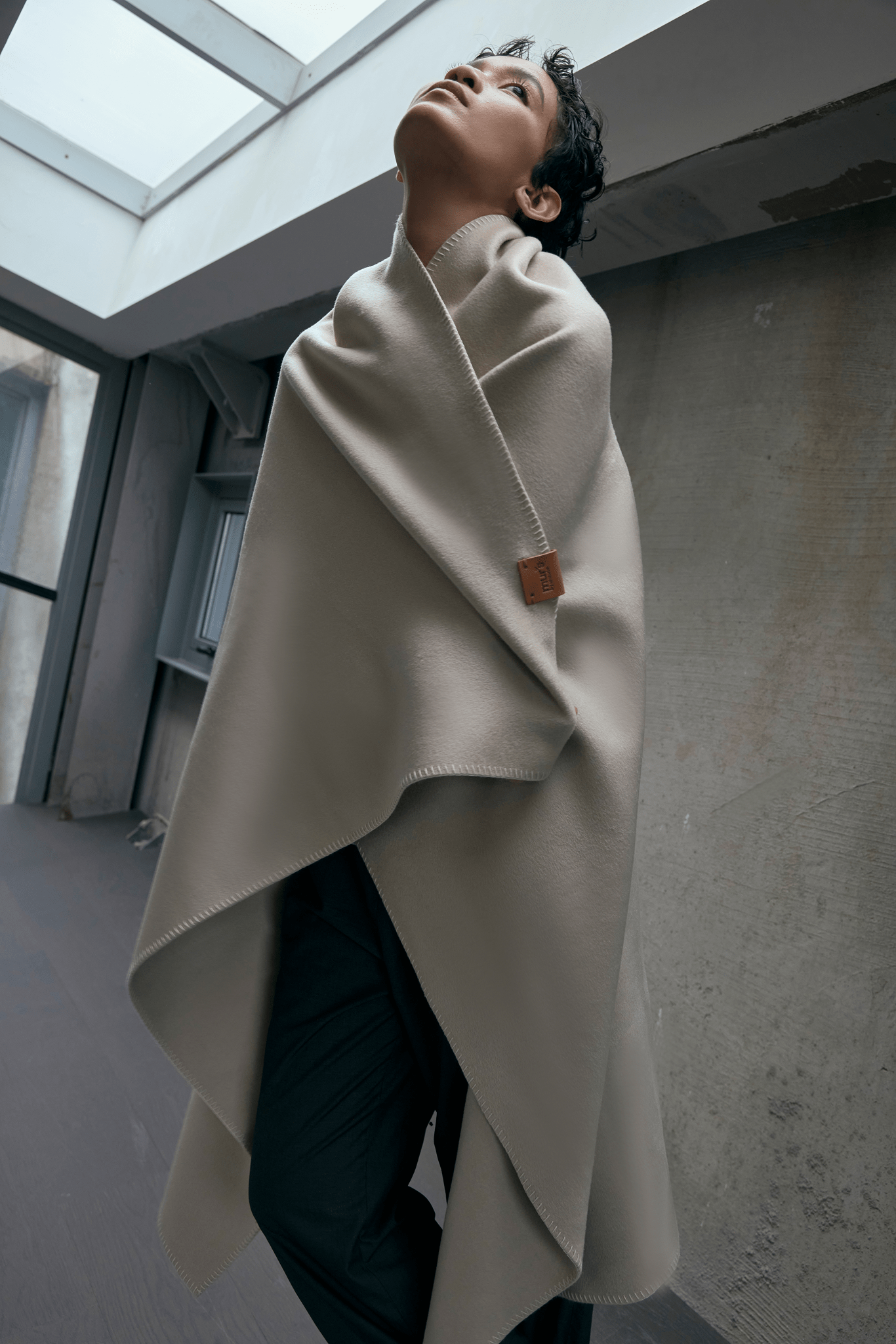 The sculptural cut allows it to sit comfortably across shoulders, layer over sweaters or coats, or be folded compactly for travel. Suitable for all genders and body types.