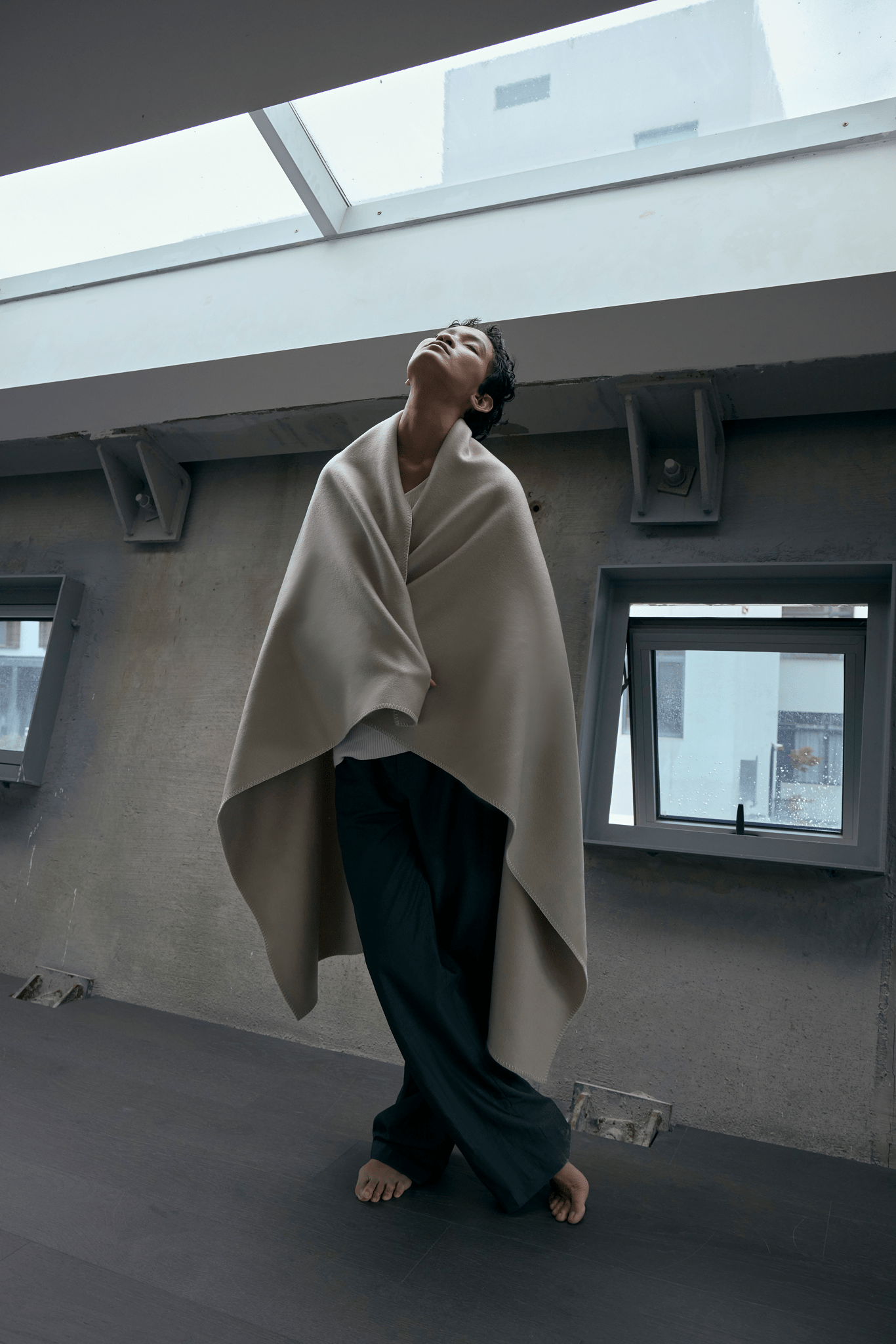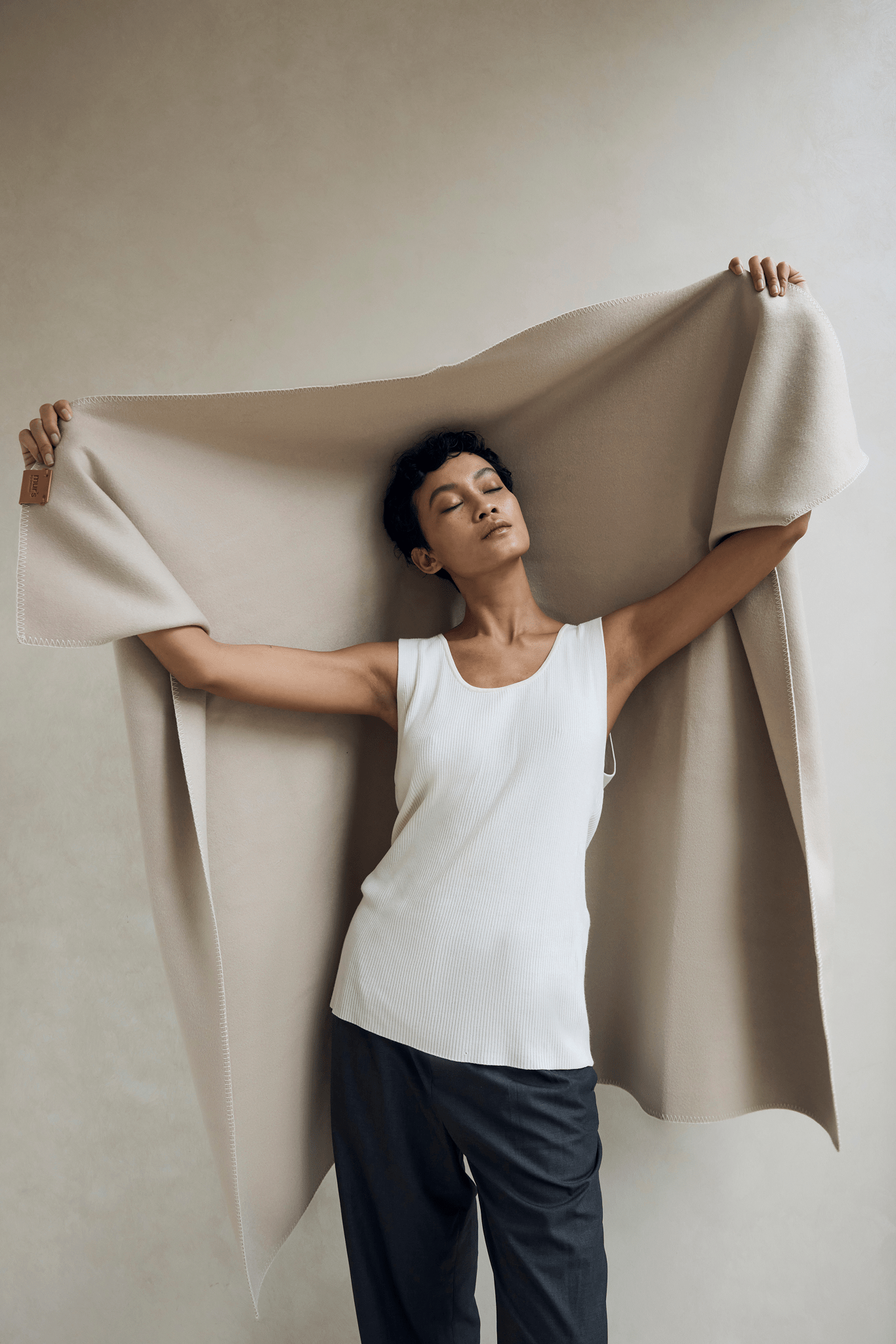 Woven from 90% lambswool and 10% cashmere, this square throw offers a perfect balance of warmth, softness, and breathability. Its versatile cut and clean edge finishing make it suitable for layering, draping, or simply grounding your space. Wherever you are — on the chair, sofa, or train — it wraps you in quiet focus.